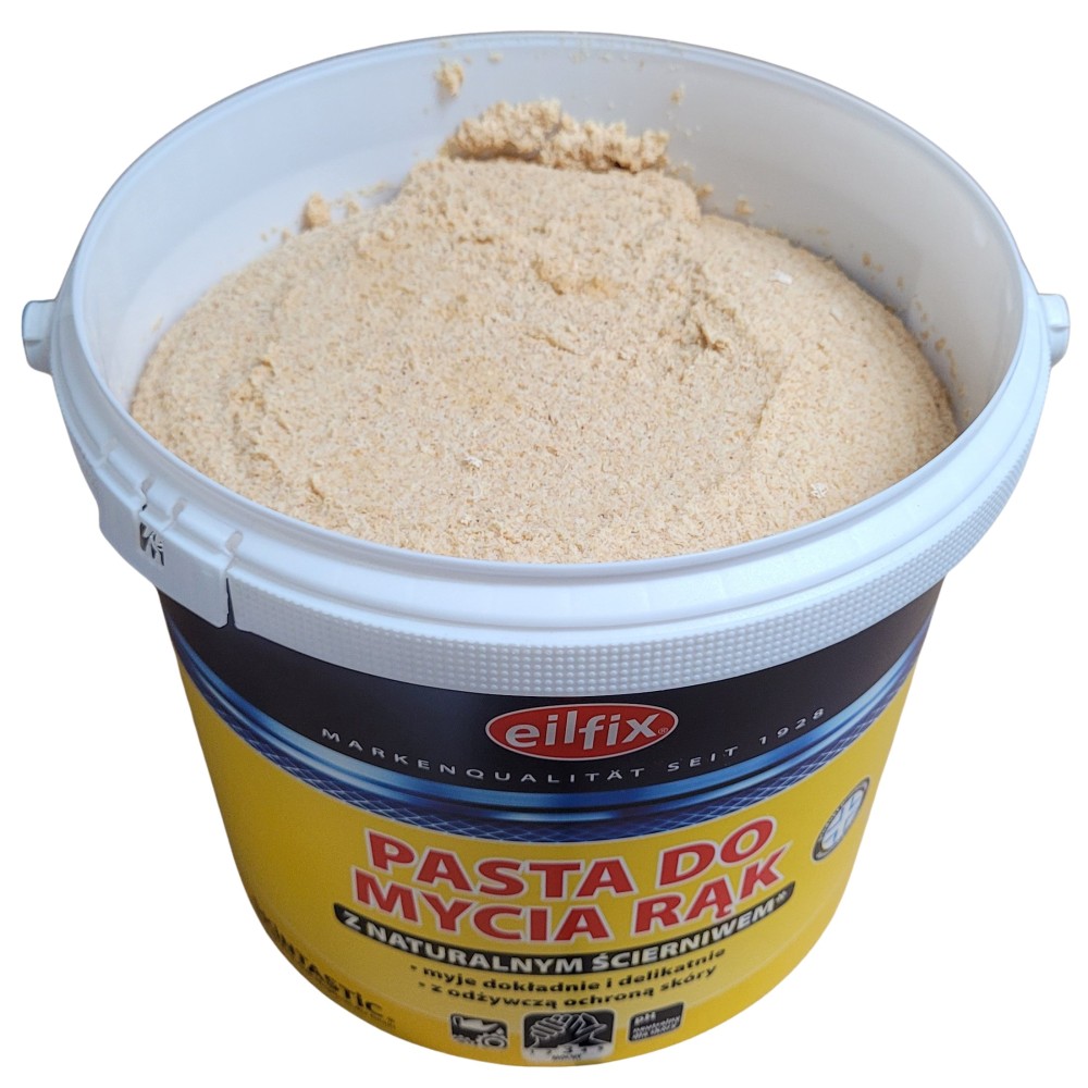 Pasta Eilfix 10 l to skuteczny produkt do mycia silnie zabrudzonych rąk. Zawiera naturalną mączkę drzewną jako środek ścierny dzięki czemu usuwa smary, oleje, farby i grafit bez podrażniania skóry. Produkt jest ekologiczny, nie zawiera piasku ani nie zatyka kanalizacji. Idealnie sprawdzi się w warsztacie, garażu a także w domowych warunkach.